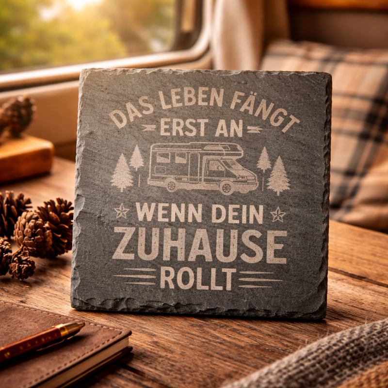 Natur-Schieferplatten mit echtem Charakter: Von der stilvollen Brotzeit-Platte bis zur gravierten Erinnerung an deinen Lieblingsspot – robust, edel und ein Stück Natur für Deinen Camper.
