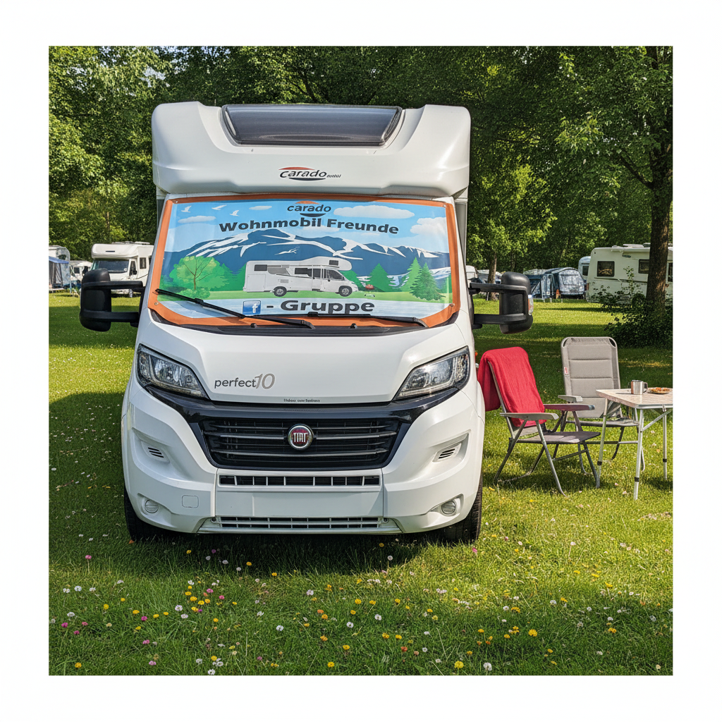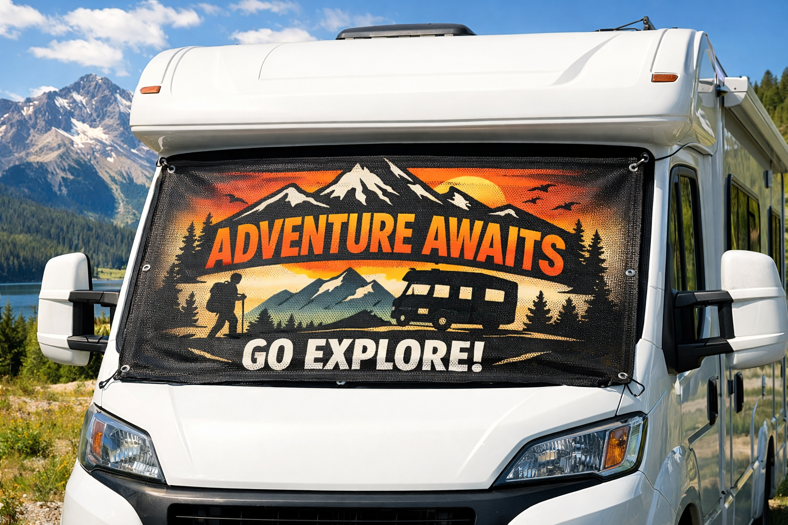Dein Wohnmobil, Dein Style! Verwandle Deine Frontscheibe mit unseren individuellen Bannern in einen echten Eyecatcher. Schnell befestigt, optisch unschlagbar. Und es ist gleichzeitig ein Sonnenschutz.